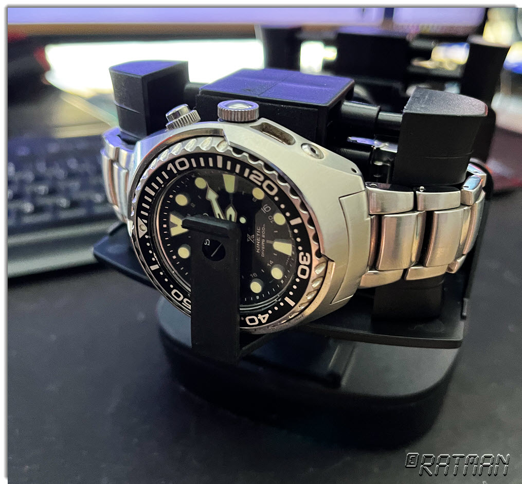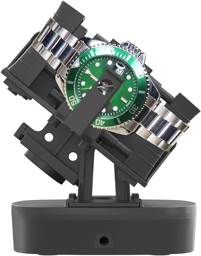 Nun bin ich beim Stöbern auf einen Typ Uhrenbeweger gestoßen, der sowohl für normale Automatik-Ticker als auch für Seiko Kinetics und ähnliche taugen soll, und das für einen Bruchteil der Kosten des englischen Umbaus. Es handelt sich dabei um eine Art Uhrenschaukel, der die Uhren schnell um die Achse des Uhrwerks hin und herschwingen läßt. Anstatt also das Gewicht rotieren zu lassen, steht eben dieses still und die Uhr selbst bewegt sich, sodass sowohl Uhrenfedern aufgezogen als auch der "Dynamo" der Kinetics angetrieben werden sollen.