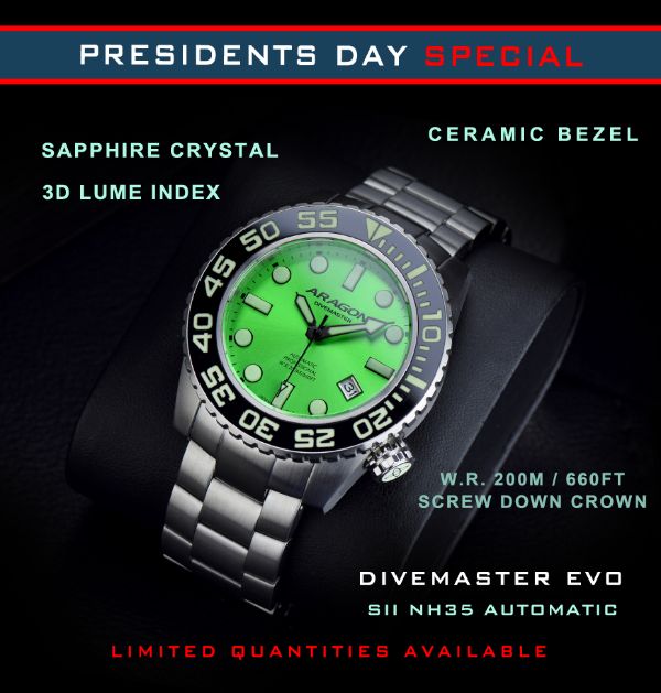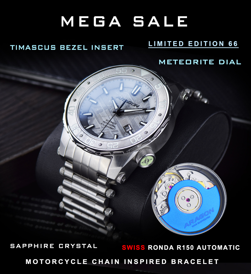 29 Feb. 2024 15:55Massive Preissenkung bei den ARAGON Modellen mit Meteorit-Ziffernblatt! Schon ab $269.00 gibt es die Sea Charger mit dem markanten Dial, ab $309.00 sogar mit Timascus Lünetteneinlage. Auch verschiedene Divemaster-Modelle sind im Angebot. Alle Preise verstehen sich zzgl. Versand und Einfuhrabgaben.