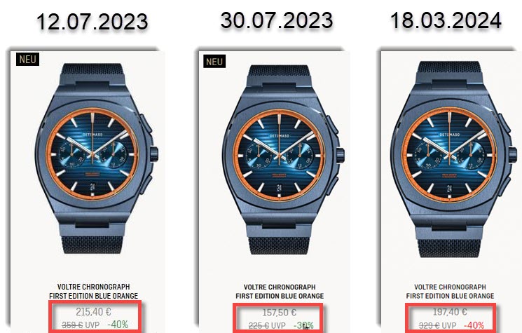 ). In der Zwischenzeit wurden die Preise wohl wieder nach oben korrigiert, so dass die jüngste Rabattaktion leider überschaubar ausfällt. Hier mal eine Gegenüberstellung der Preise für das blaue "Voltre" Modell: