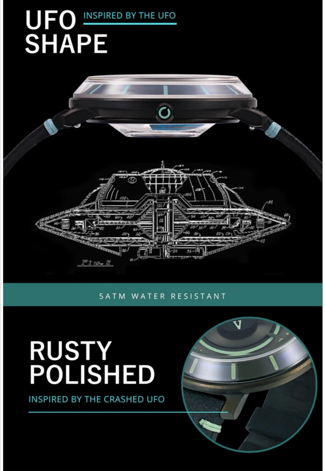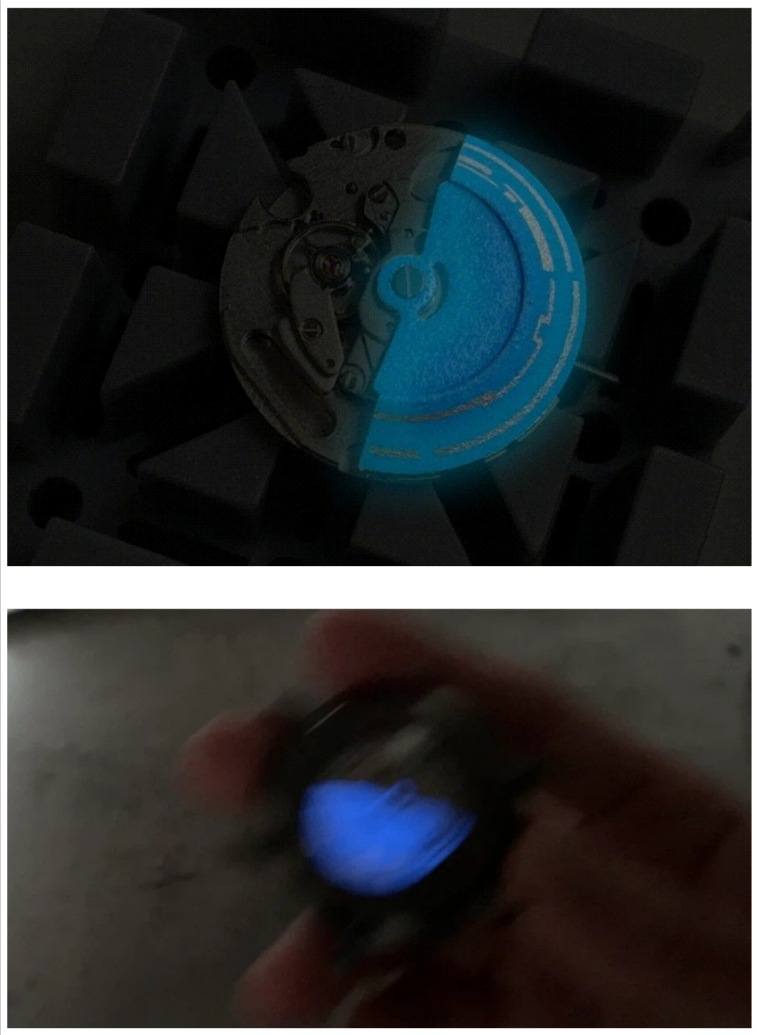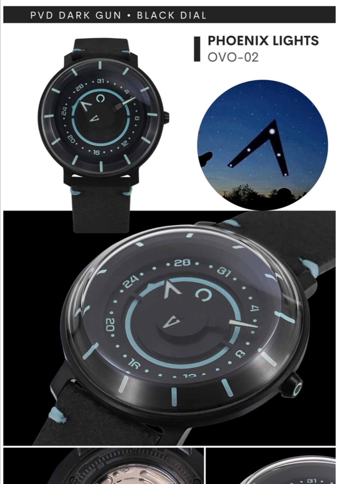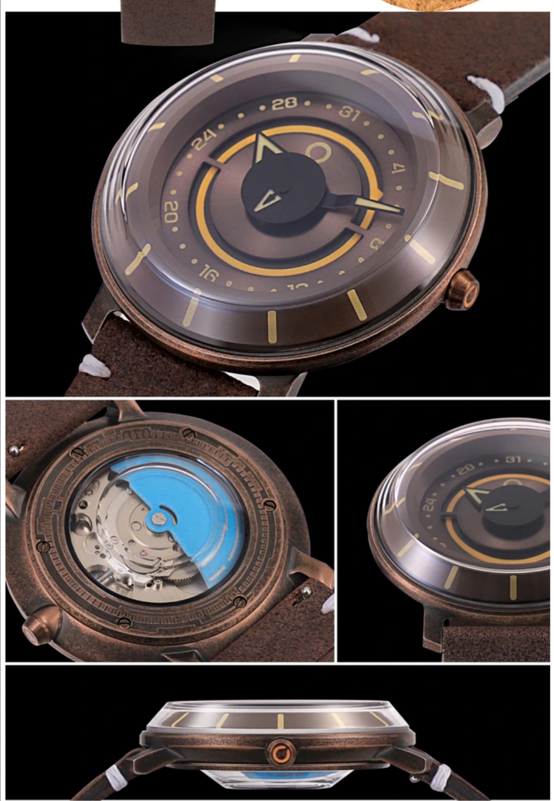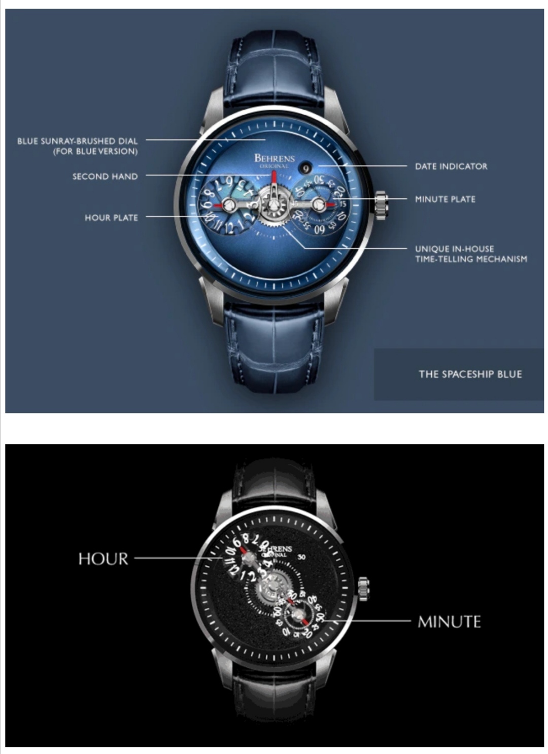 Besonderheit ist ein selbst entwickelter Zeigermechanismus / Aufsatz für ein Miyota 9015, welches den Stunden--und Minutenzeiger als Scheibe über das Blatt drehen lassen.