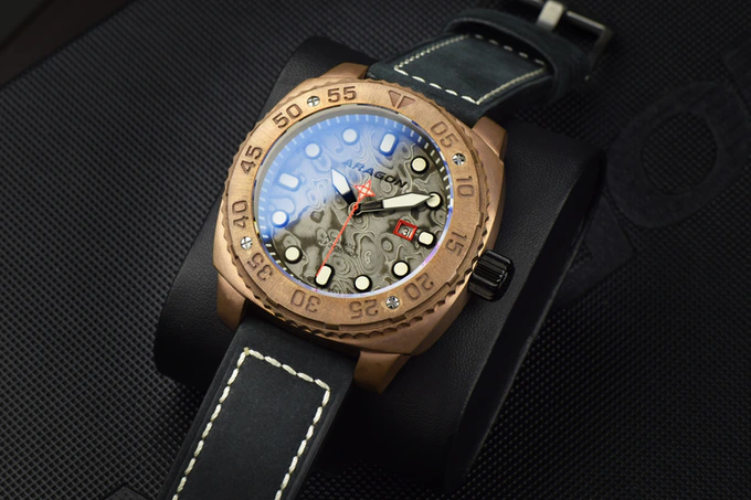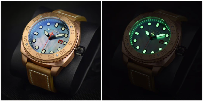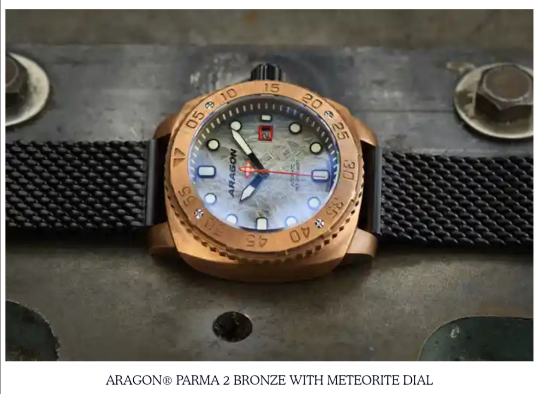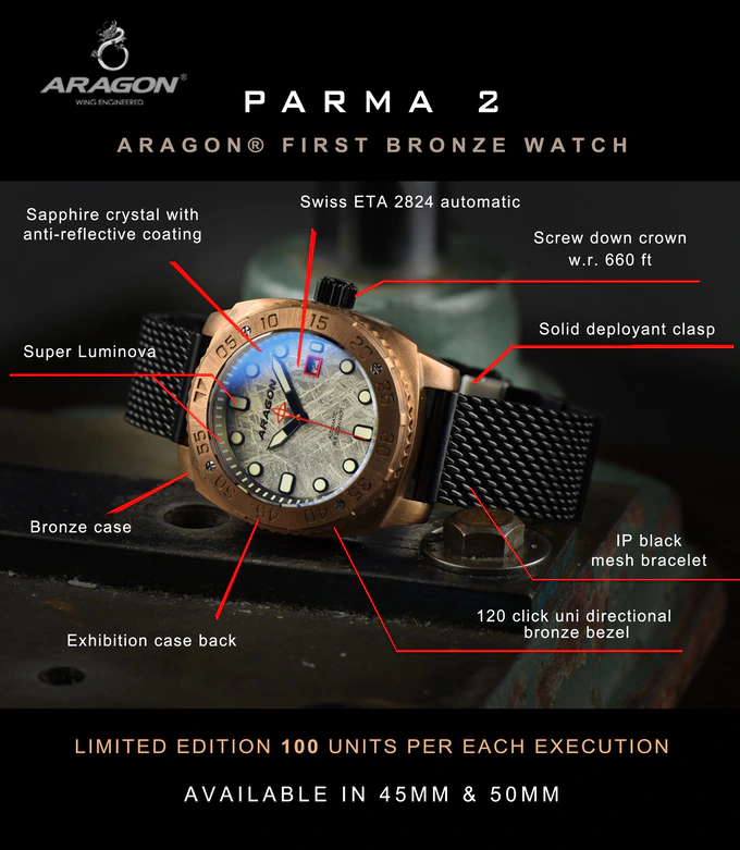 Eine neue Kickstarter-Kampagne von Aragon: Die ARAGON Parma 2 Automatic , mit ETA 2824 Werk, Bronze Case, Saphirglas, zwei Größen (45 + 50mm) und drei verschiedenen Dials zur Auswahl.