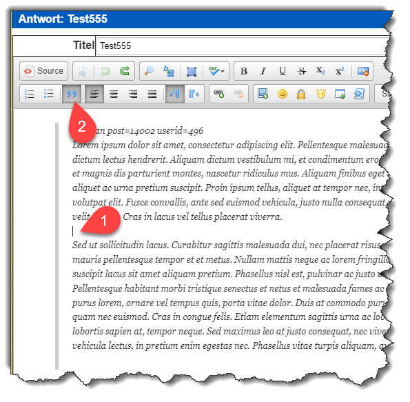 WICHTIG! Zitierten Text immer nur dort auftrennen, wo sich eine Leerzeile befindet! Wenn keine Leerzeile da ist, müsst ihr als erstes eine solche einfügen, also die Schreibmarke ans Ende der gewünschten Zeile setzen und die Eingabetaste drücken. Im Bild ob steht die Schreibmarke (1) an der Stelle, wo ich den zitierten Text unterbrechen und einen eigenen Text als Antwort einfügen möchte. Dazu klicke ich auf den "Block Quote" Button (2), also die Taste mit den doppelten Anführungszeichen, damit die Zitatmarkierung an dieser Stelle aufgehoben wird. Der Button erscheint danach nicht mehr eingedrückt.