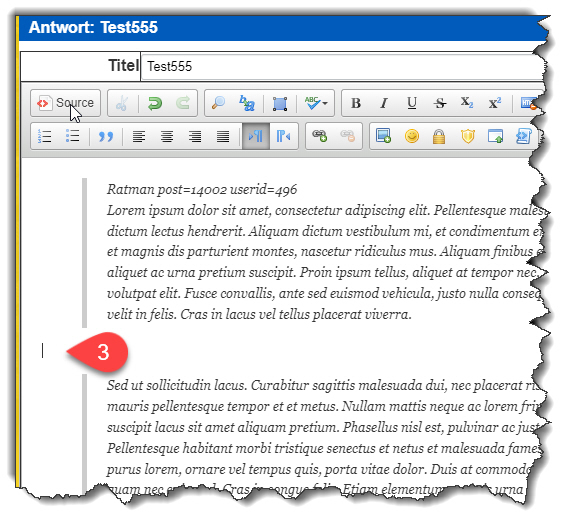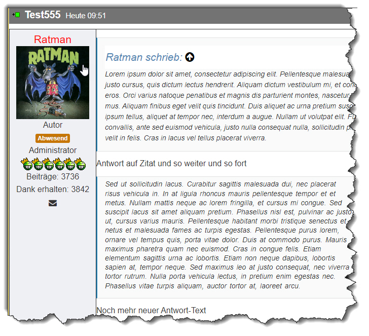 Nachdem ich meinen Text eingegeben habe, klicke ich auf "Absenden" unterhalb des Editors und mein Beitrag erscheint so wie gewünscht, mit einer neuen Antwort innerhalb des zitierten Beitrags