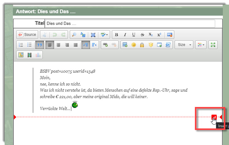 Das Zitat ist daran zu erkennen, dass ein senkrechter grauer Balken links neben dem Text zu sehen ist. Um nun selbst ein paar eigene Worte dazu zu schreiben, bewegt ihr euren Mauszeiger knapp unter- oder oberhalb des Zitats. Sobald ihr die richtige Stelle erreicht habt, erscheint eine gestrichelte rote Linie und am rechten Ende derselben ein rotes "Zeilenumbruch-" oder Return-Symbol.